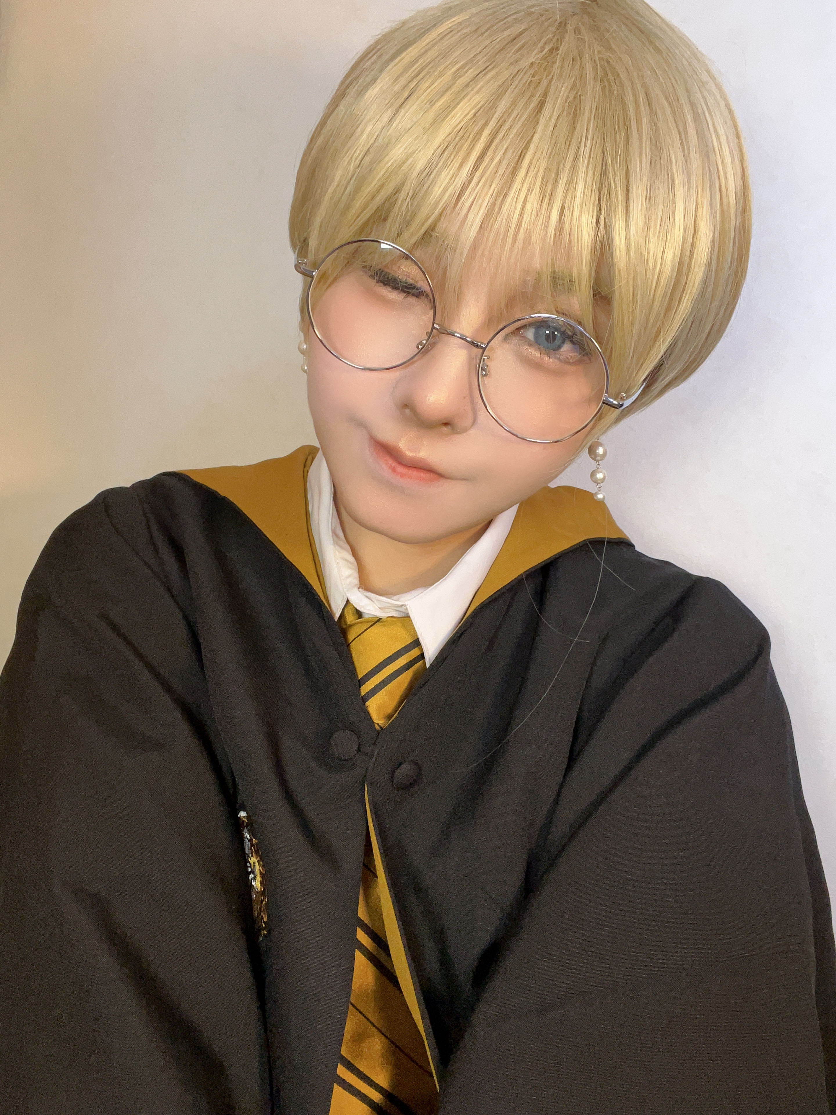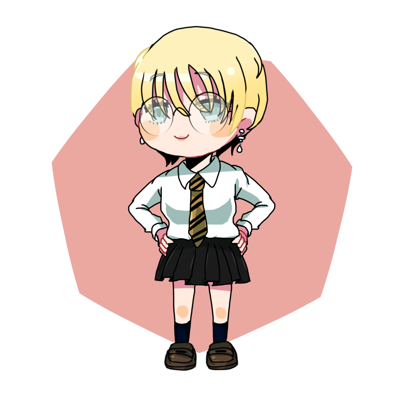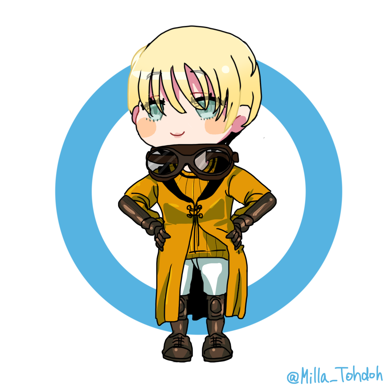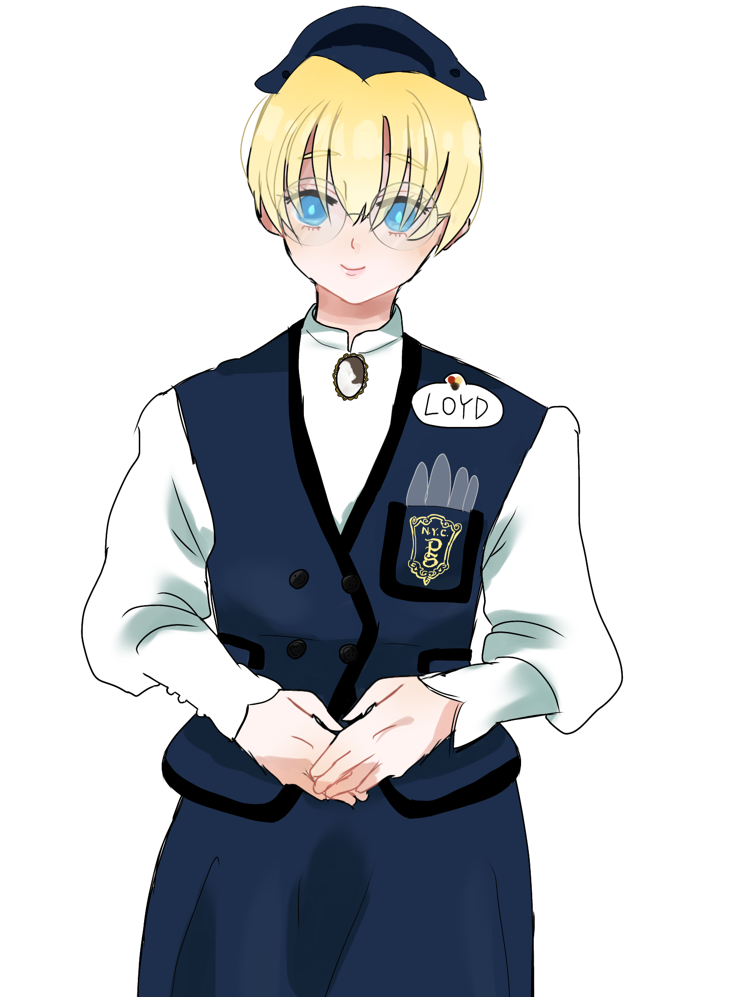 - 前髪長めのブロンドショートヘア。綺麗なブルーの瞳でお人形のような顔立ちをしている。長身細身体系