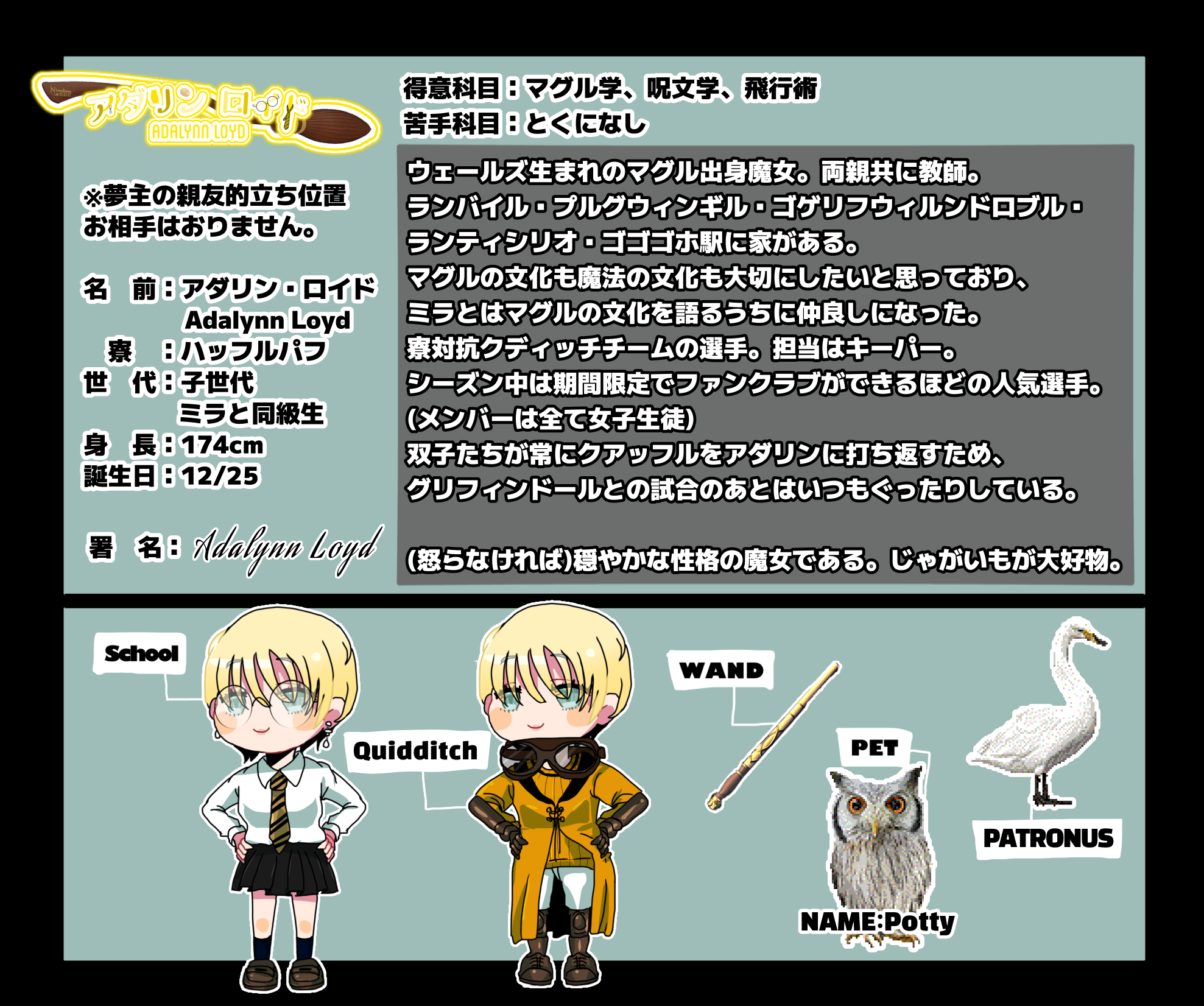 マグルの文化も魔法の文化も大切にしたいと思っており、ミラとはマグルの文化を語るうちに仲良しになった。ミラを常に心配しており、時には喧嘩に発展することもある程。