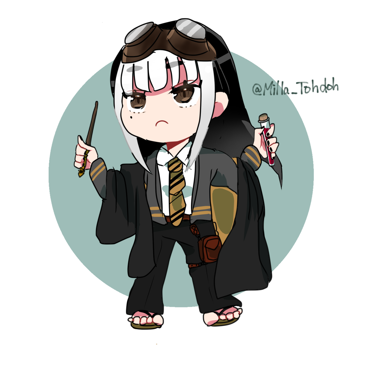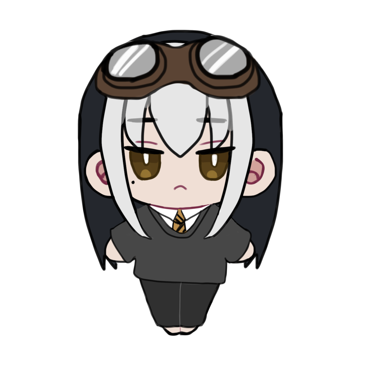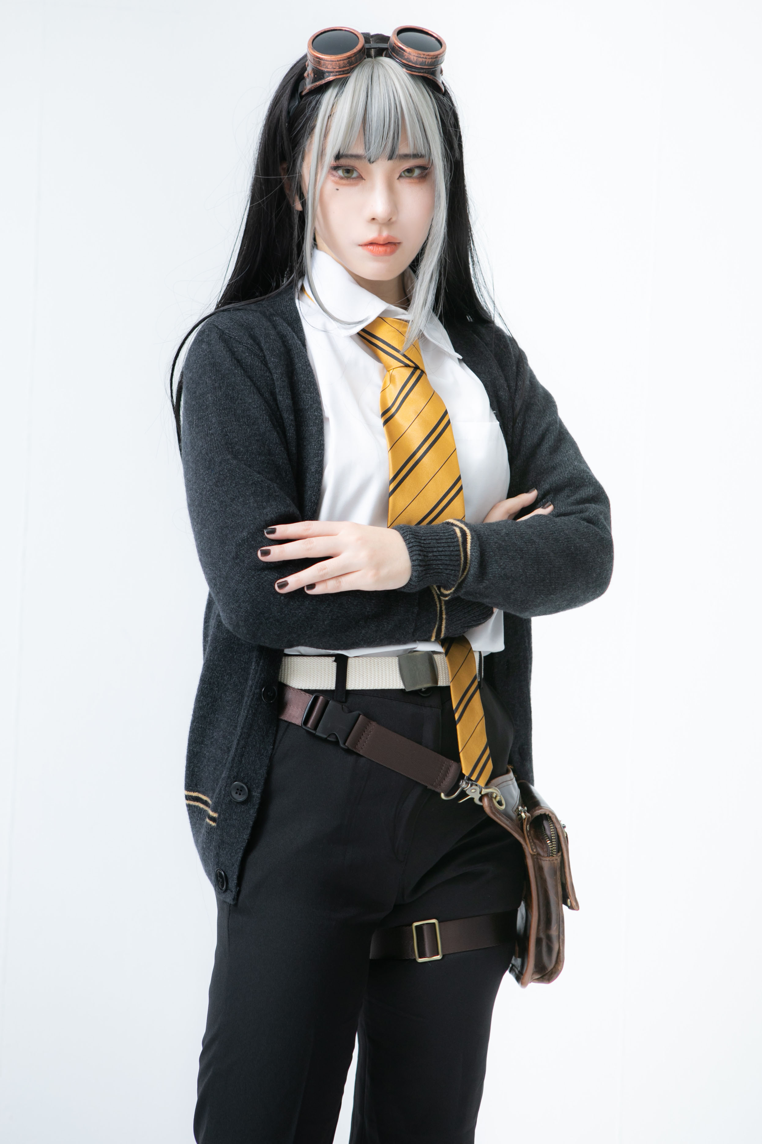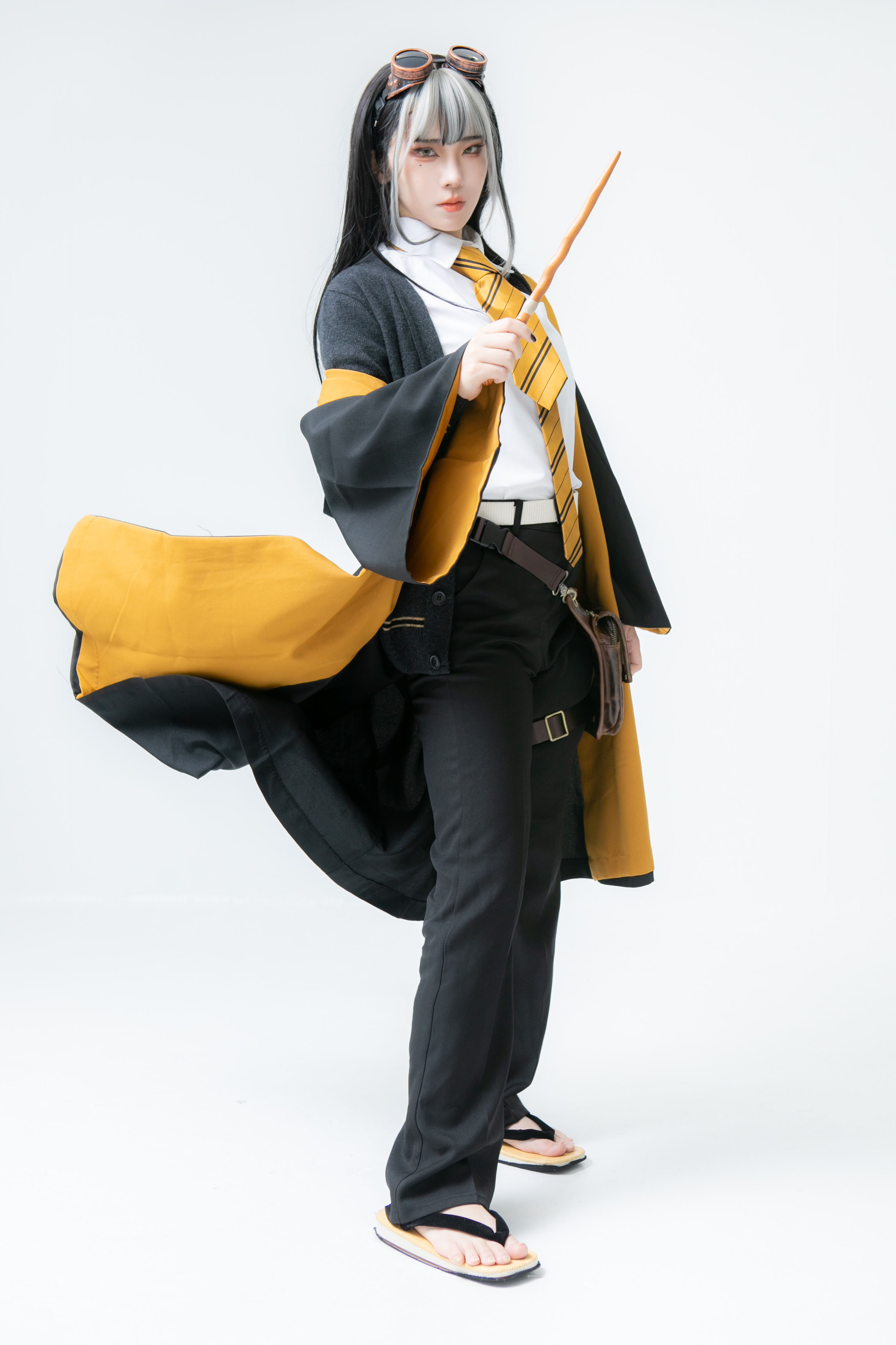 - 頭にエンジニアゴーグル、パンツスタイルに雪駄。レッグポーチをつけているのが基本。冬になると五本指ソックスを加える。 ネクタイを結ぶのが下手くそなため、常に前後の長さがチグハグでローブの羽織方も雑。 ワイシャツもはみ出てることが多い。