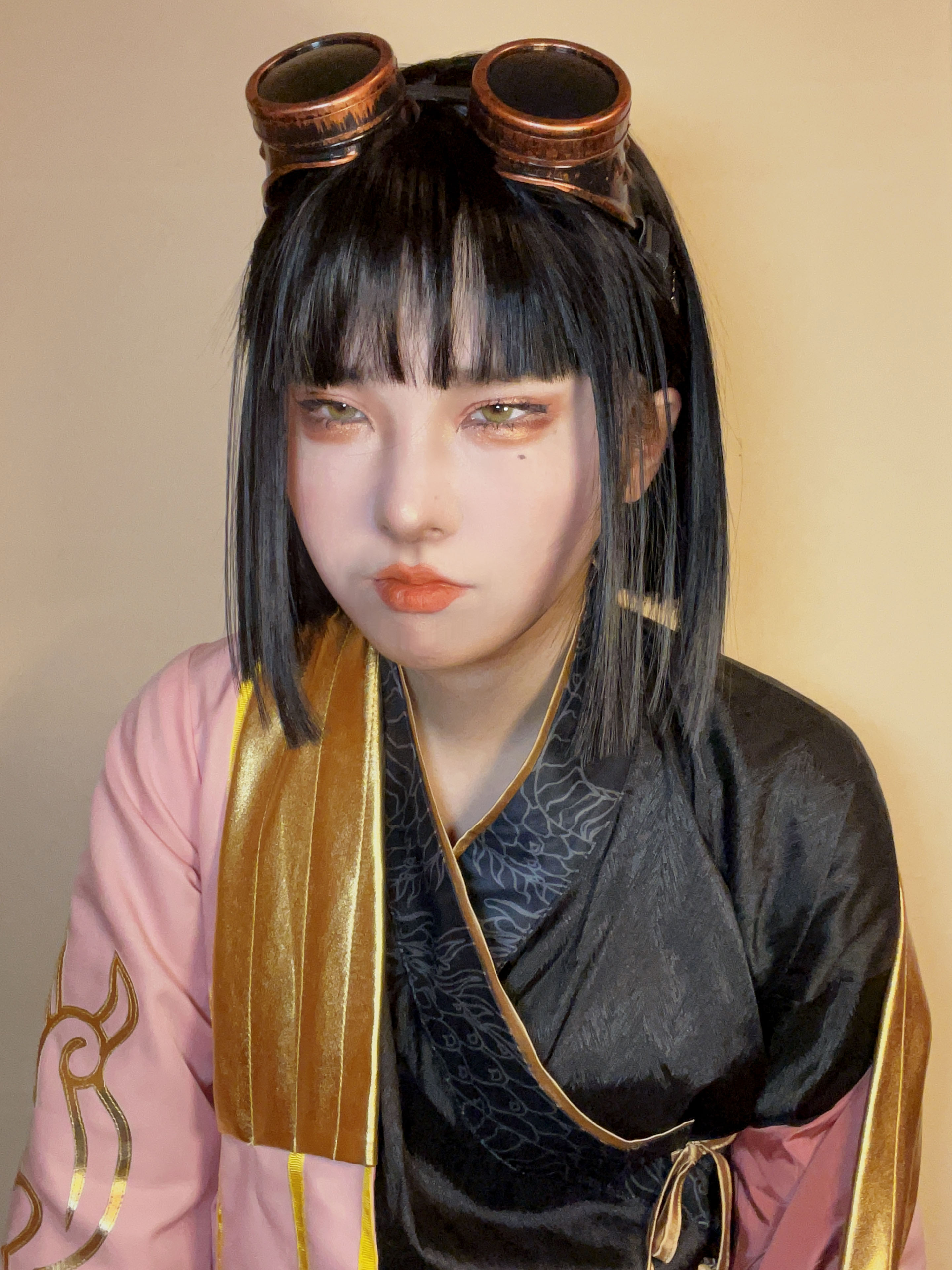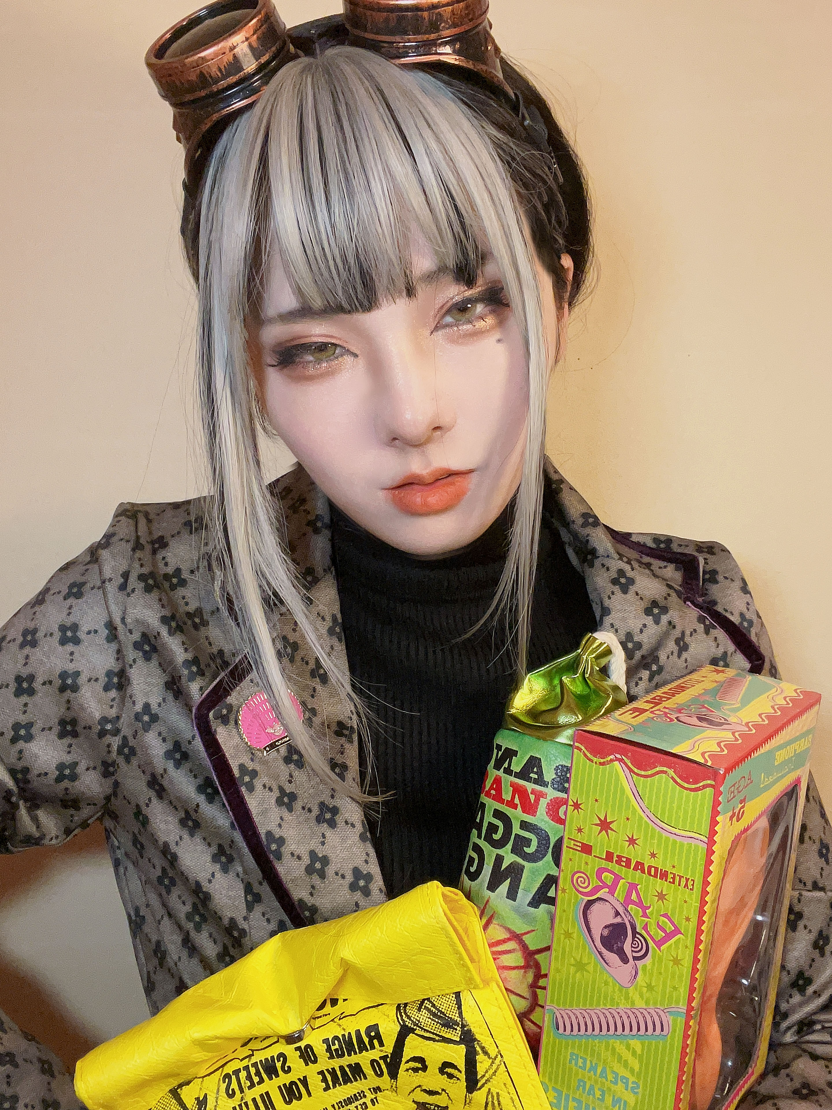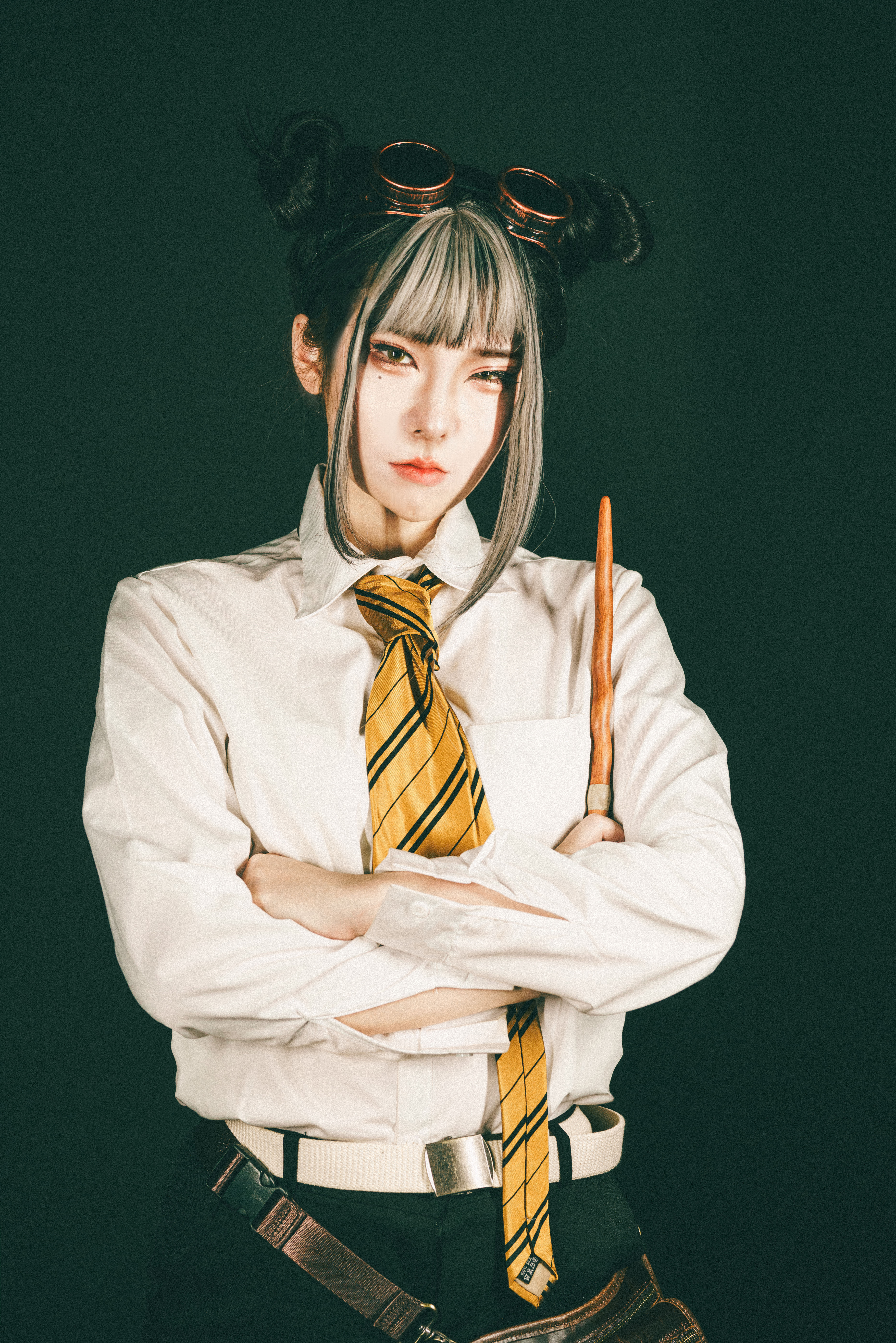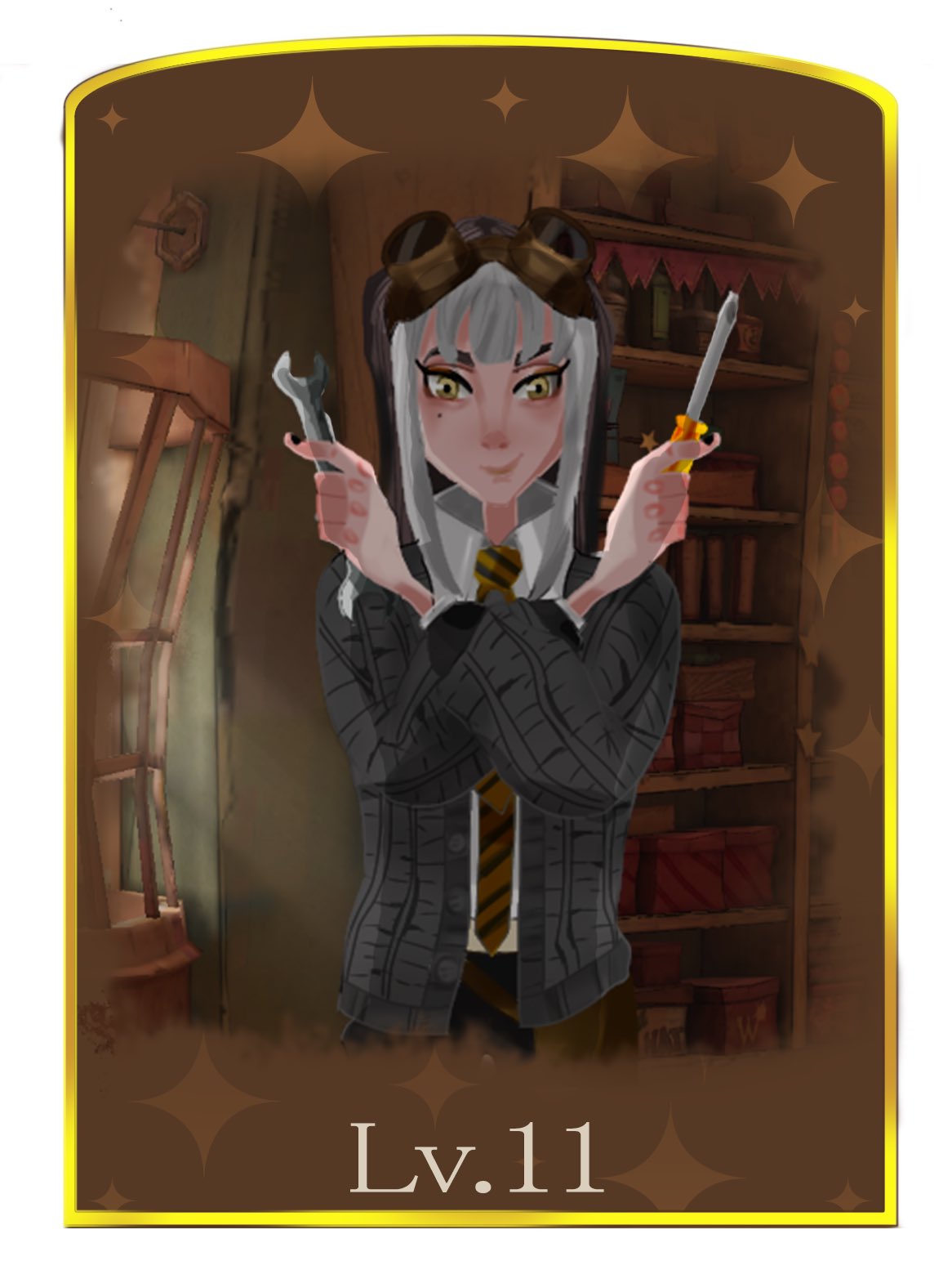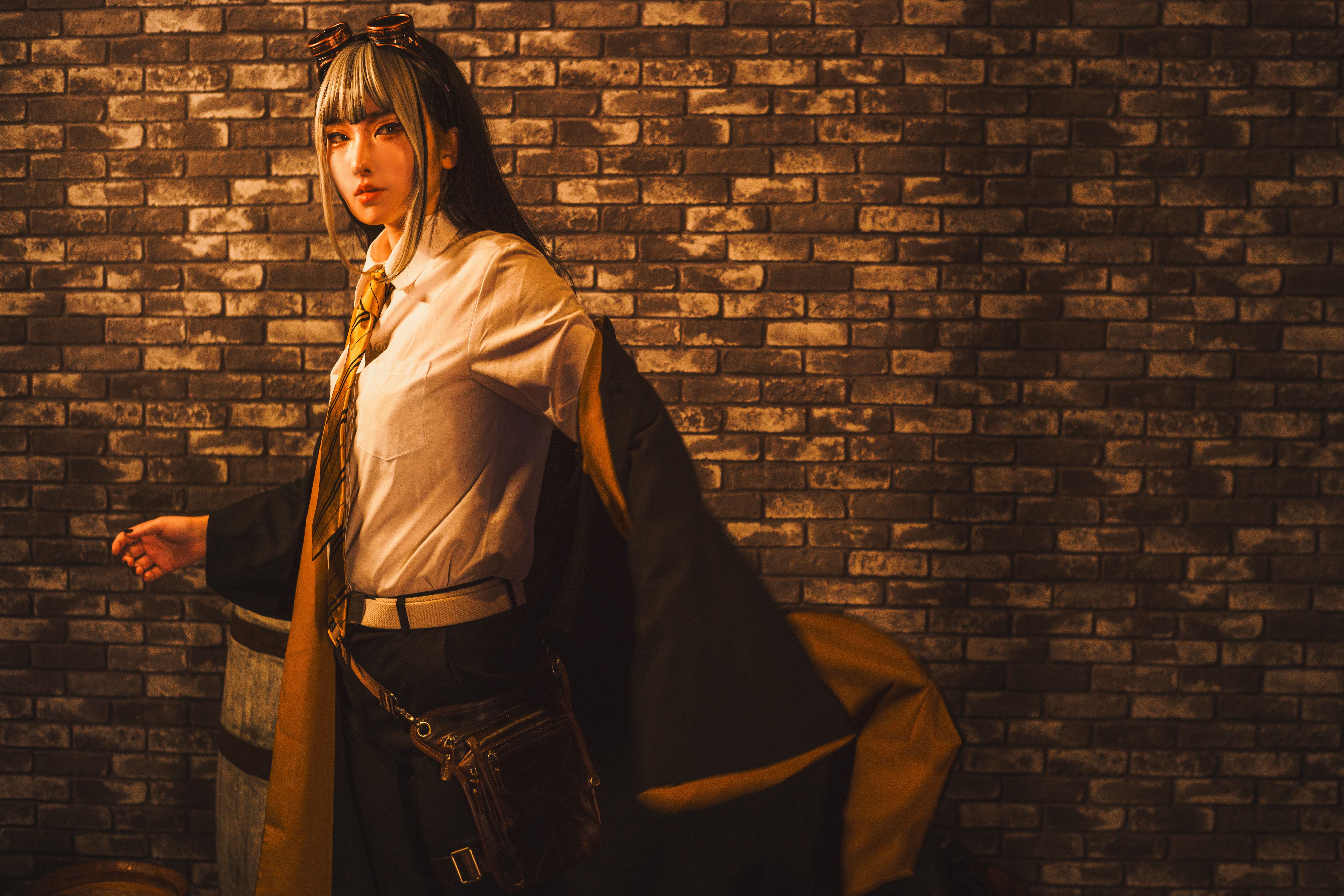 - 頭にエンジニアゴーグル、パンツスタイルに雪駄。レッグポーチをつけているのが基本。冬になると五本指ソックスを加える。 ネクタイを結ぶのが下手くそなため、常に前後の長さがチグハグでローブの羽織方も雑。 ワイシャツもはみ出てることが多い。