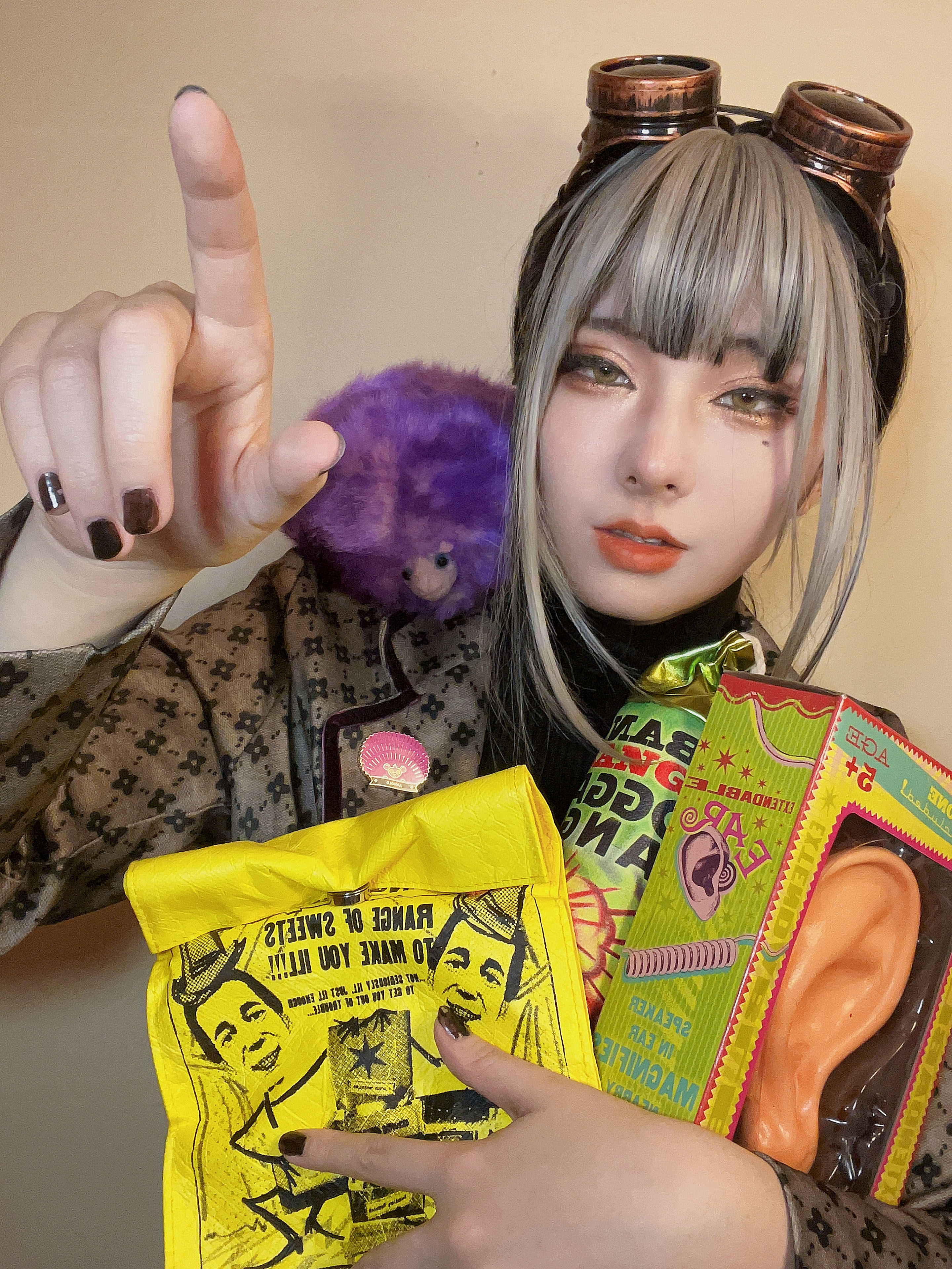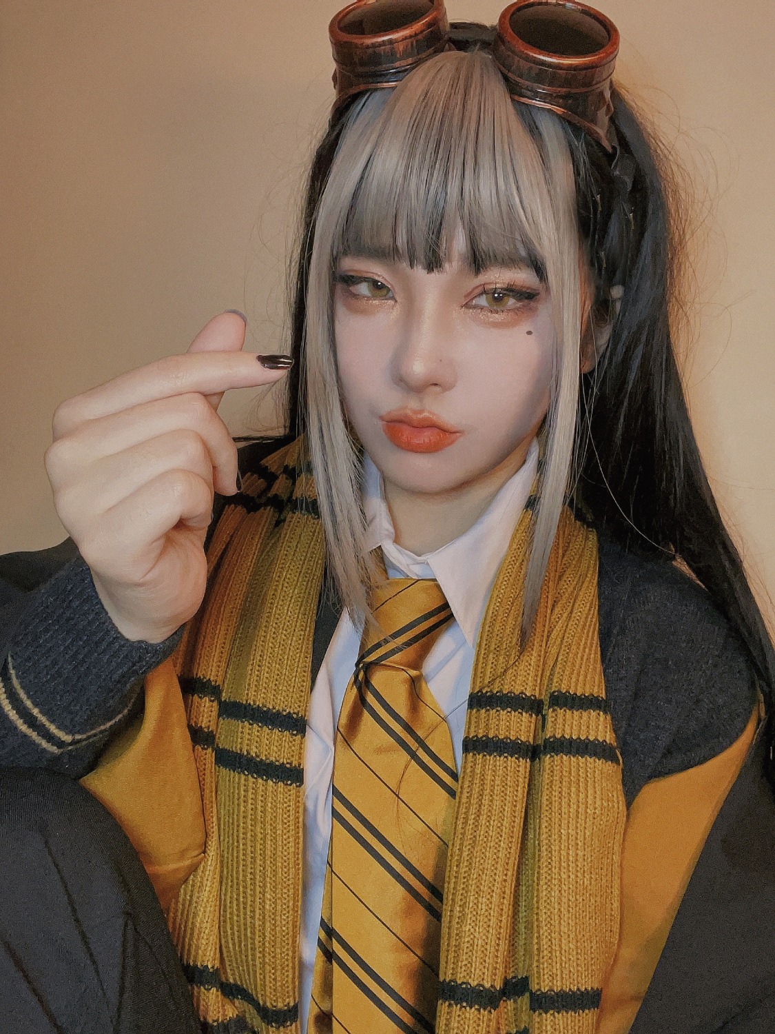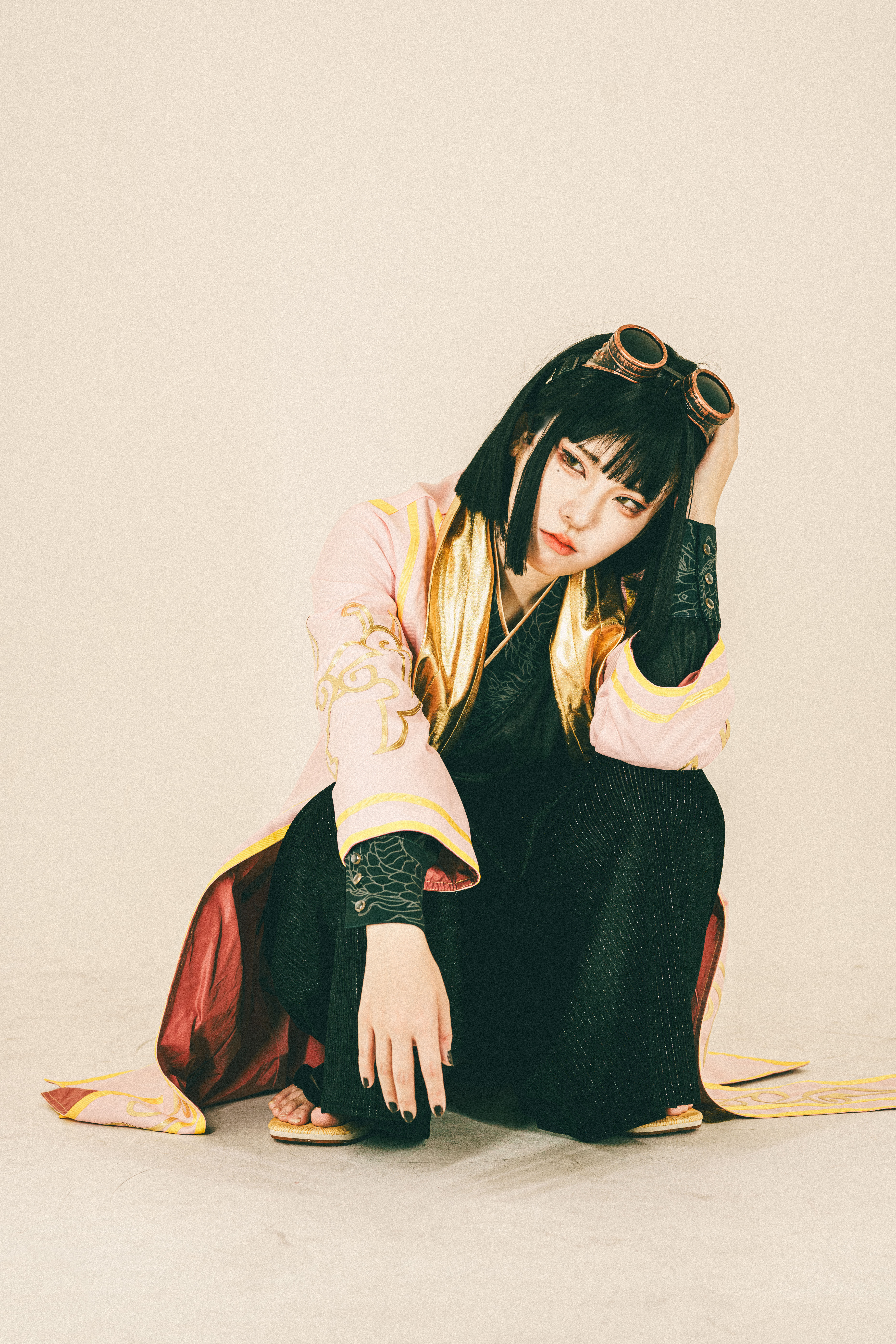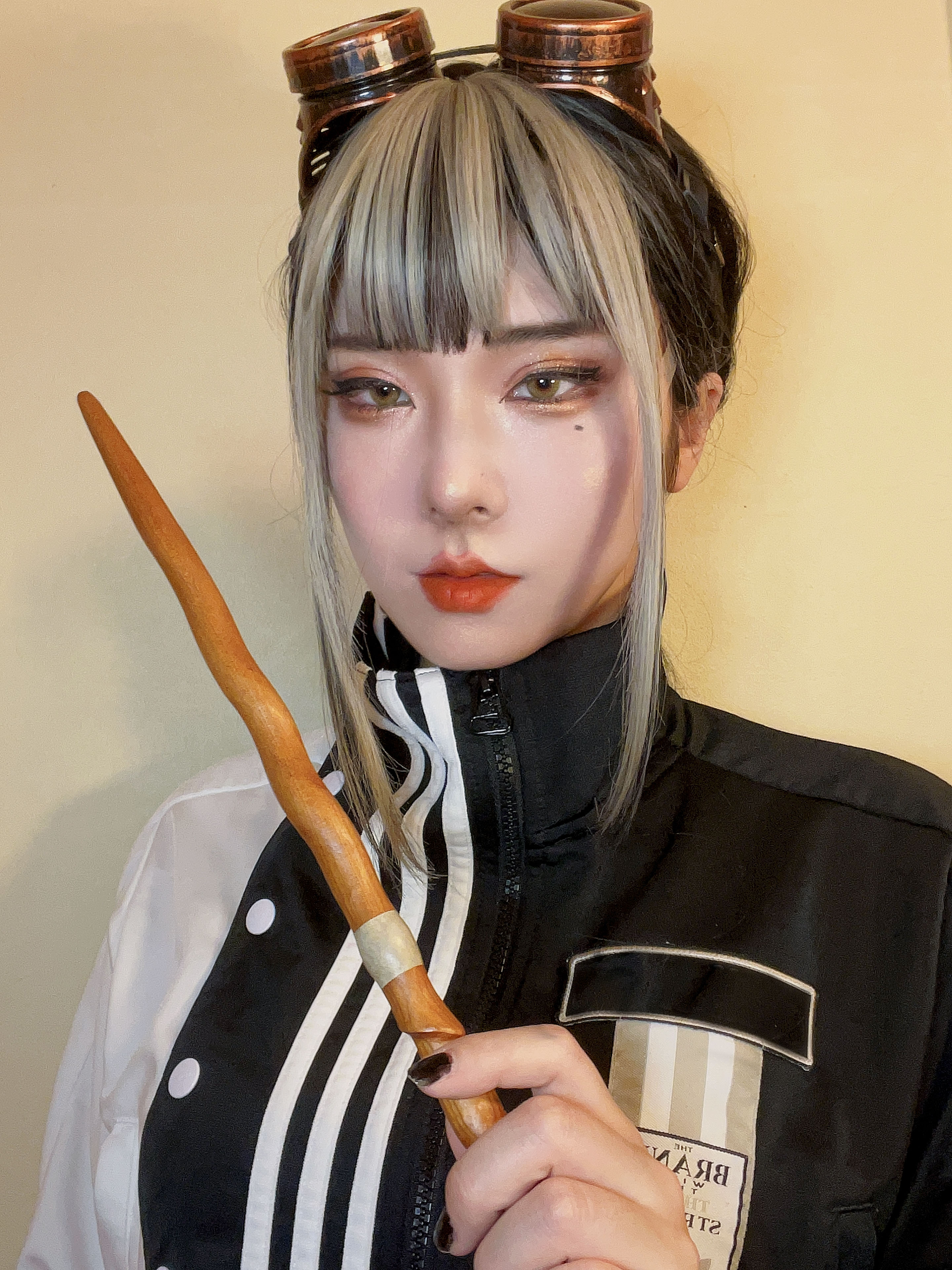 - 頭にエンジニアゴーグル、パンツスタイルに雪駄。レッグポーチをつけているのが基本。冬になると五本指ソックスを加える。 ネクタイを結ぶのが下手くそなため、常に前後の長さがチグハグでローブの羽織方も雑。 ワイシャツもはみ出てることが多い。