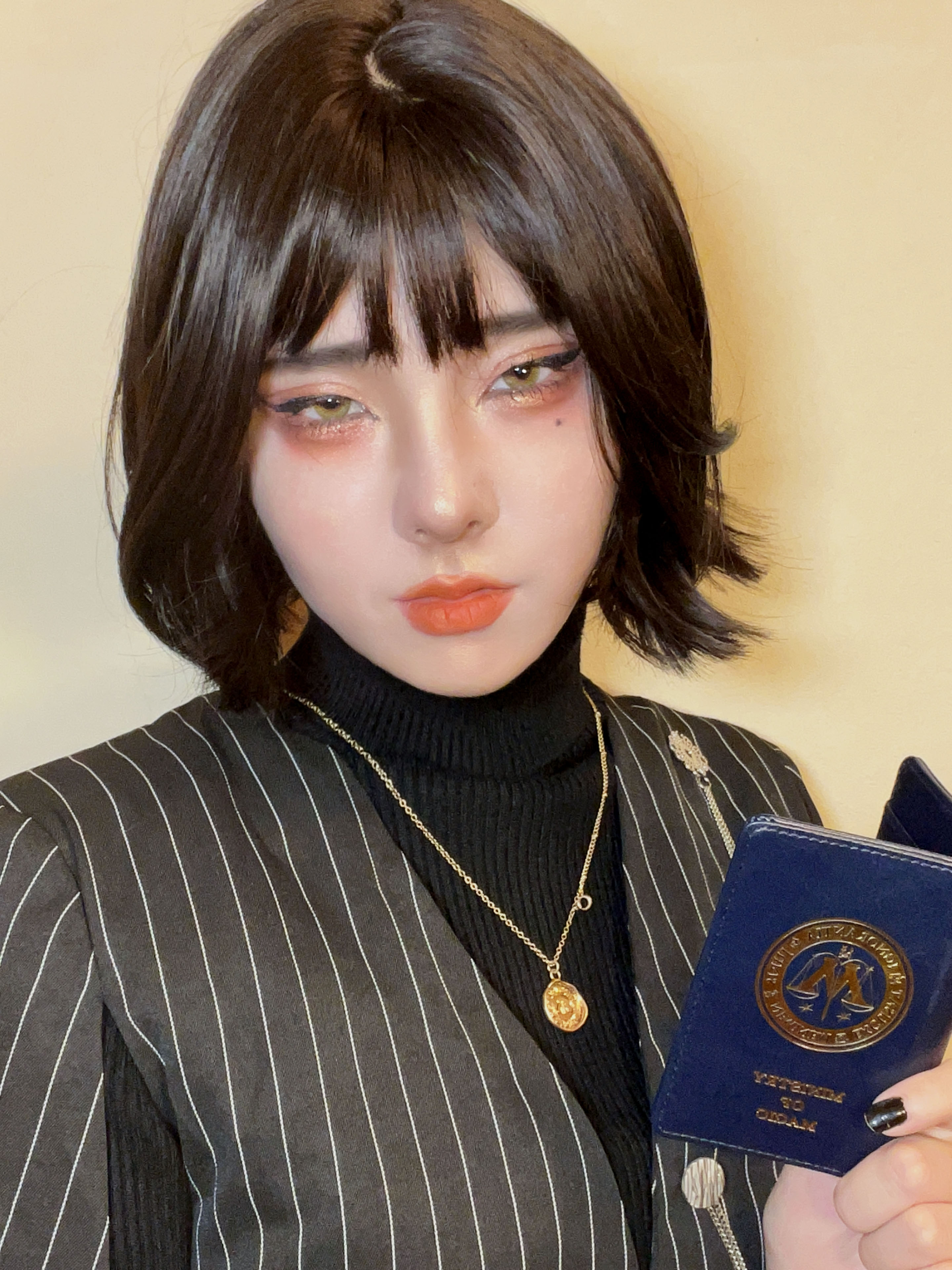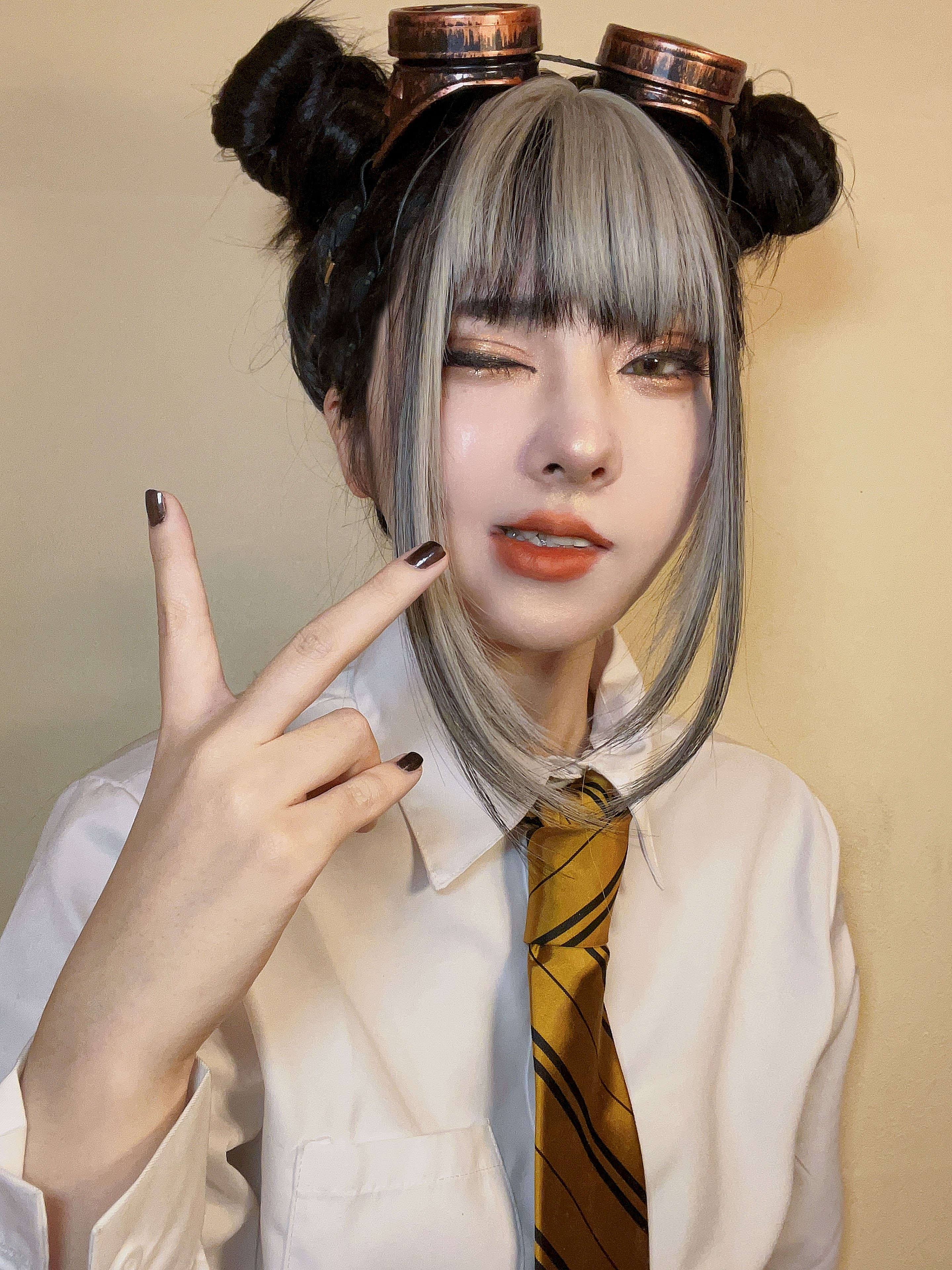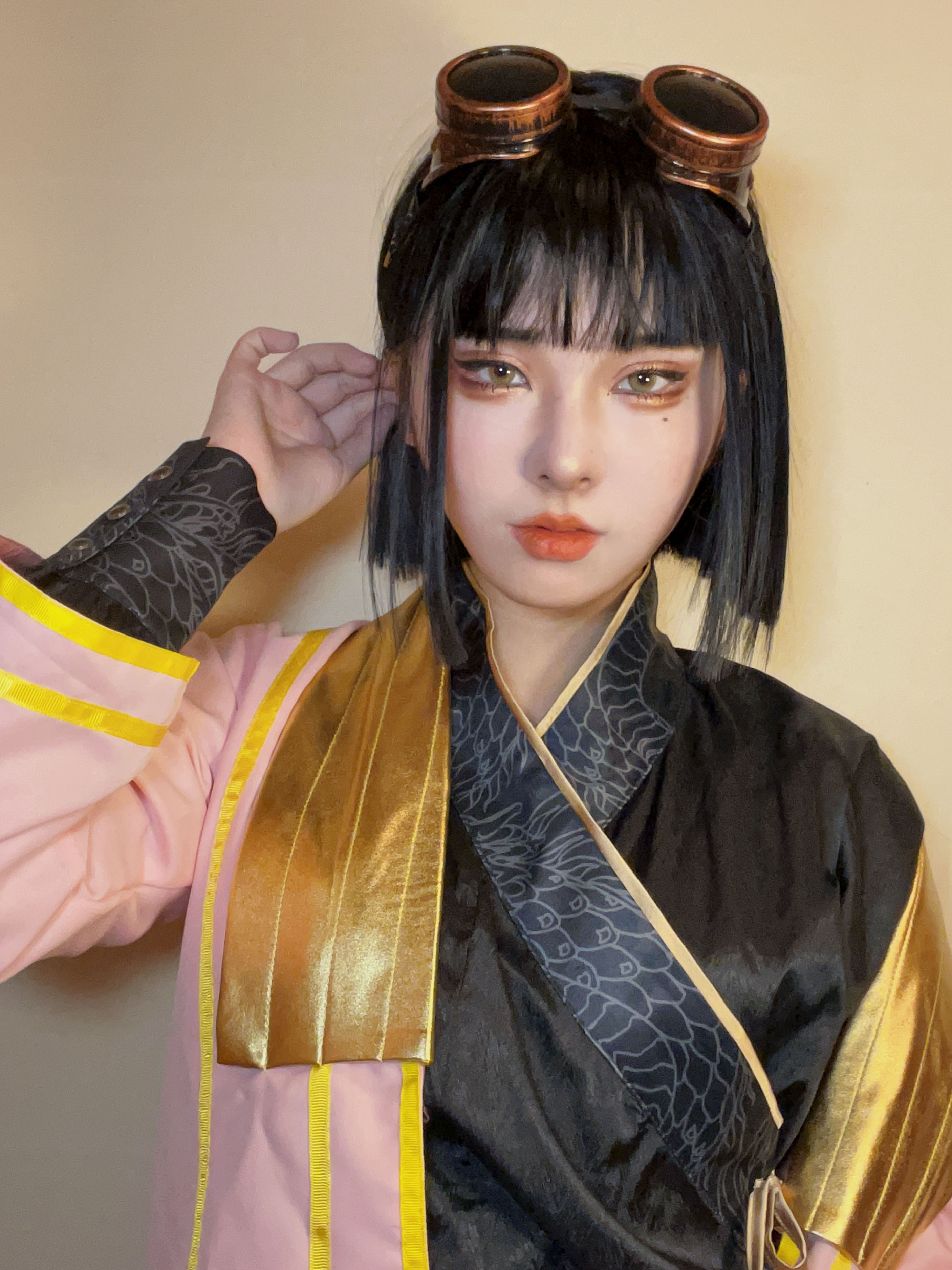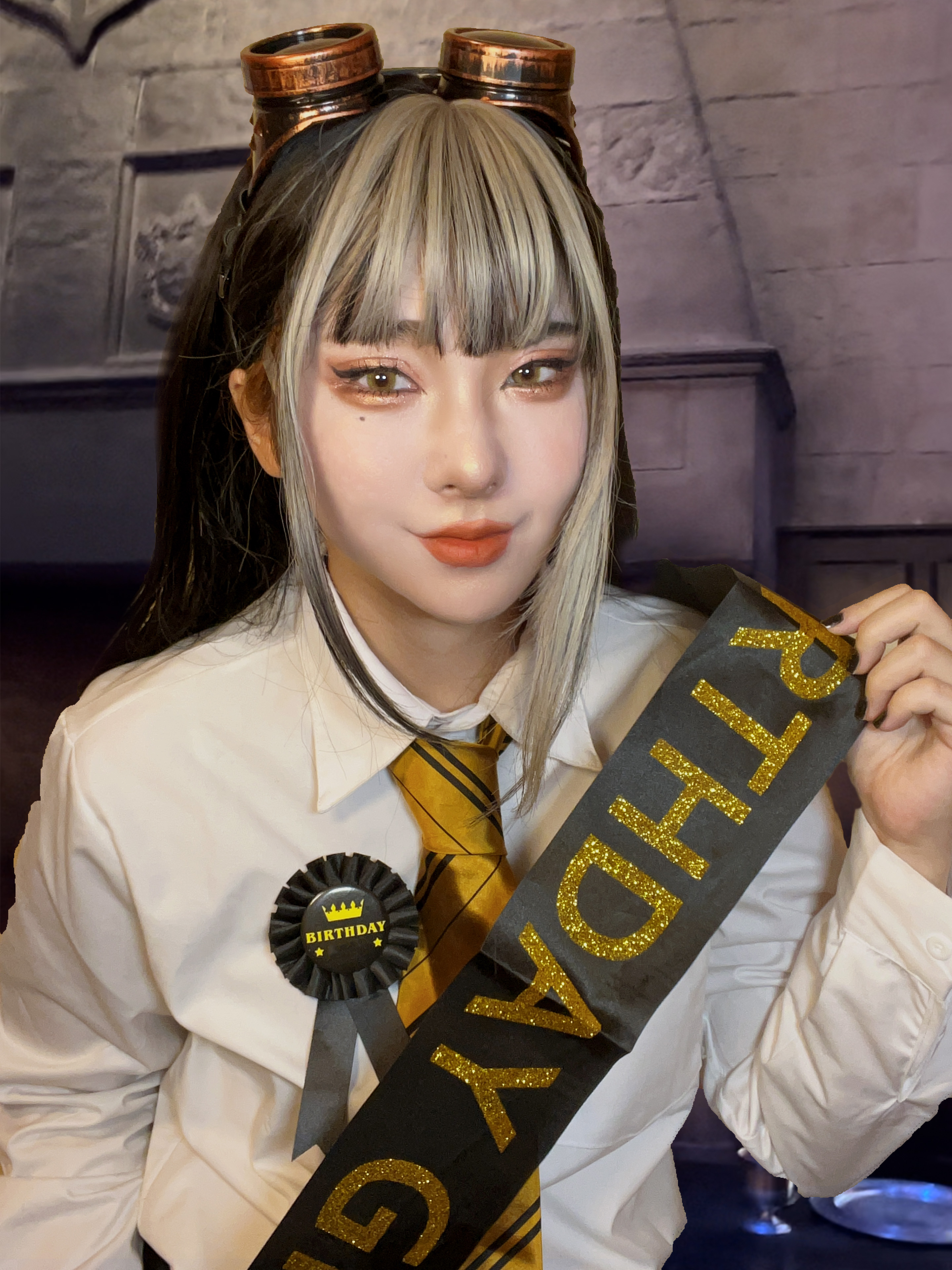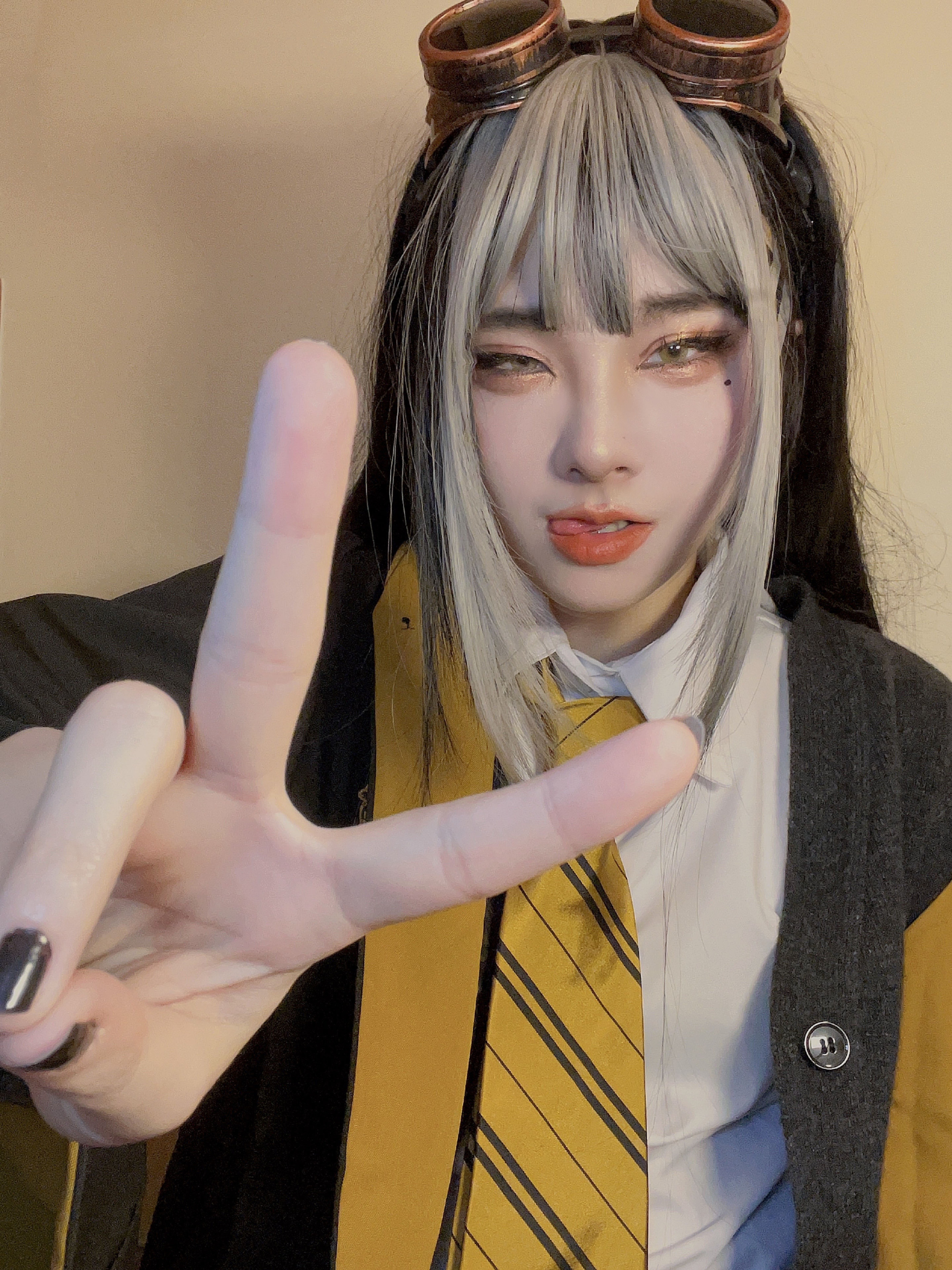 - 頭にエンジニアゴーグル、パンツスタイルに雪駄。レッグポーチをつけているのが基本。冬になると五本指ソックスを加える。 ネクタイを結ぶのが下手くそなため、常に前後の長さがチグハグでローブの羽織方も雑。 ワイシャツもはみ出てることが多い。