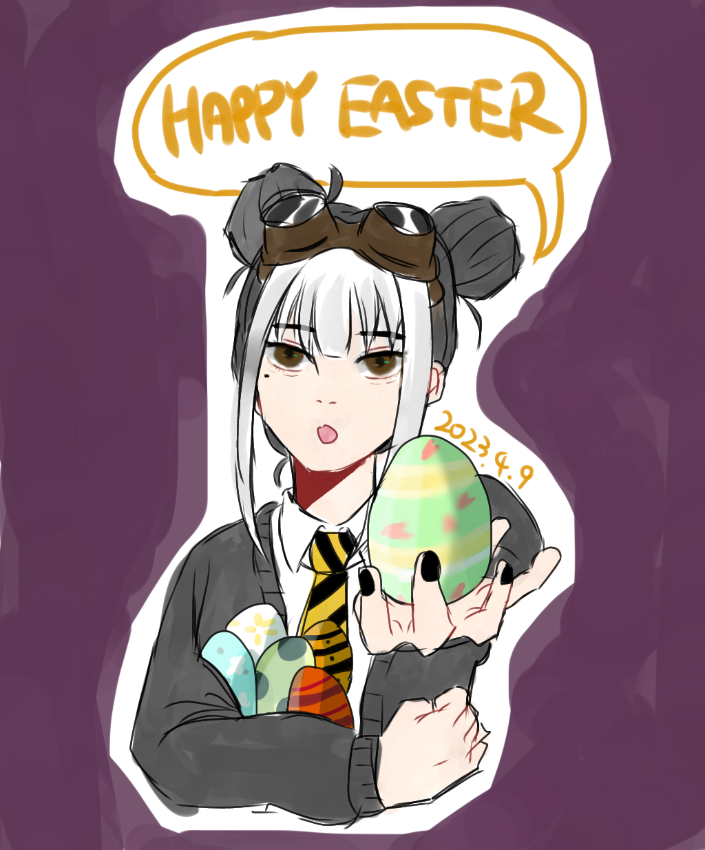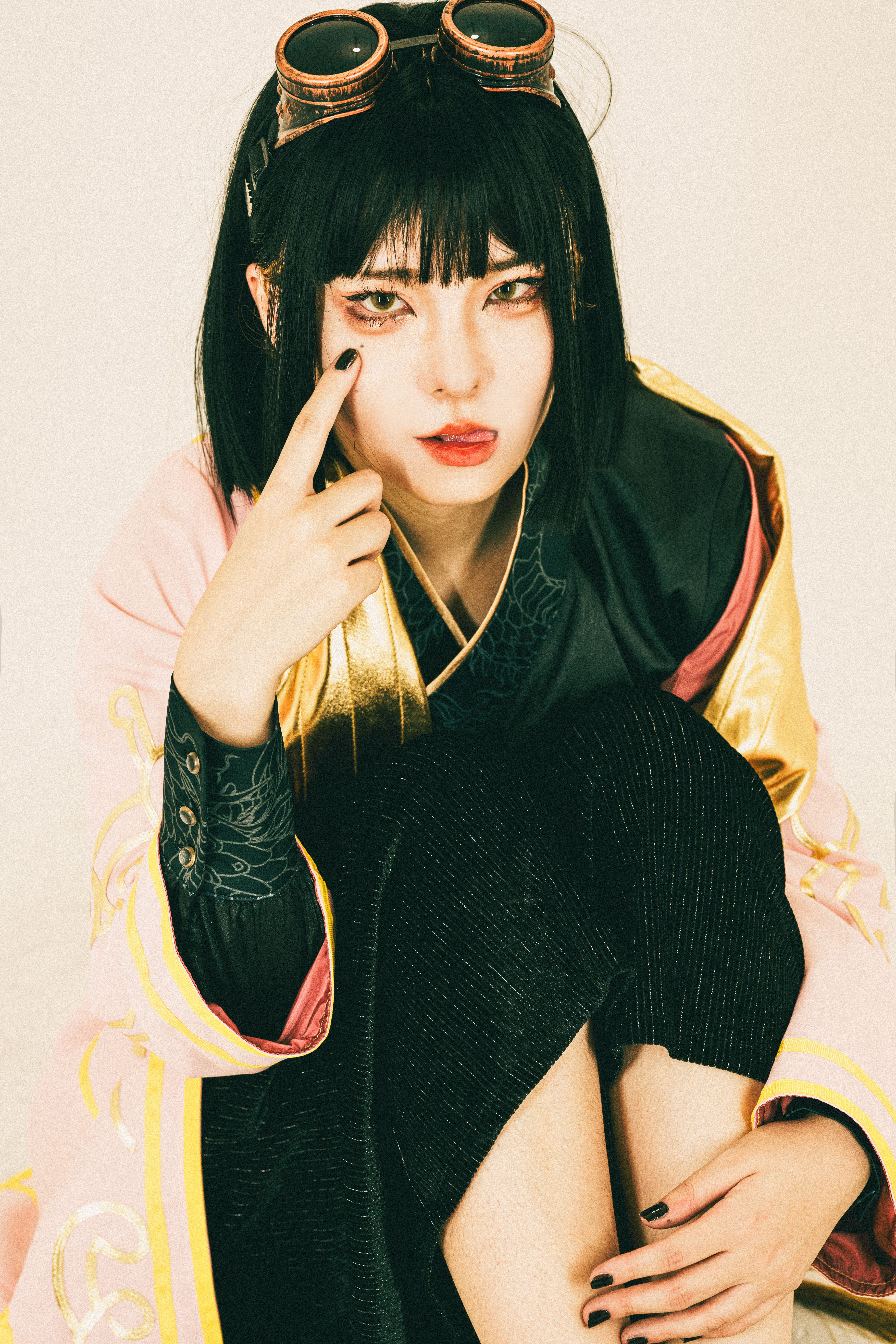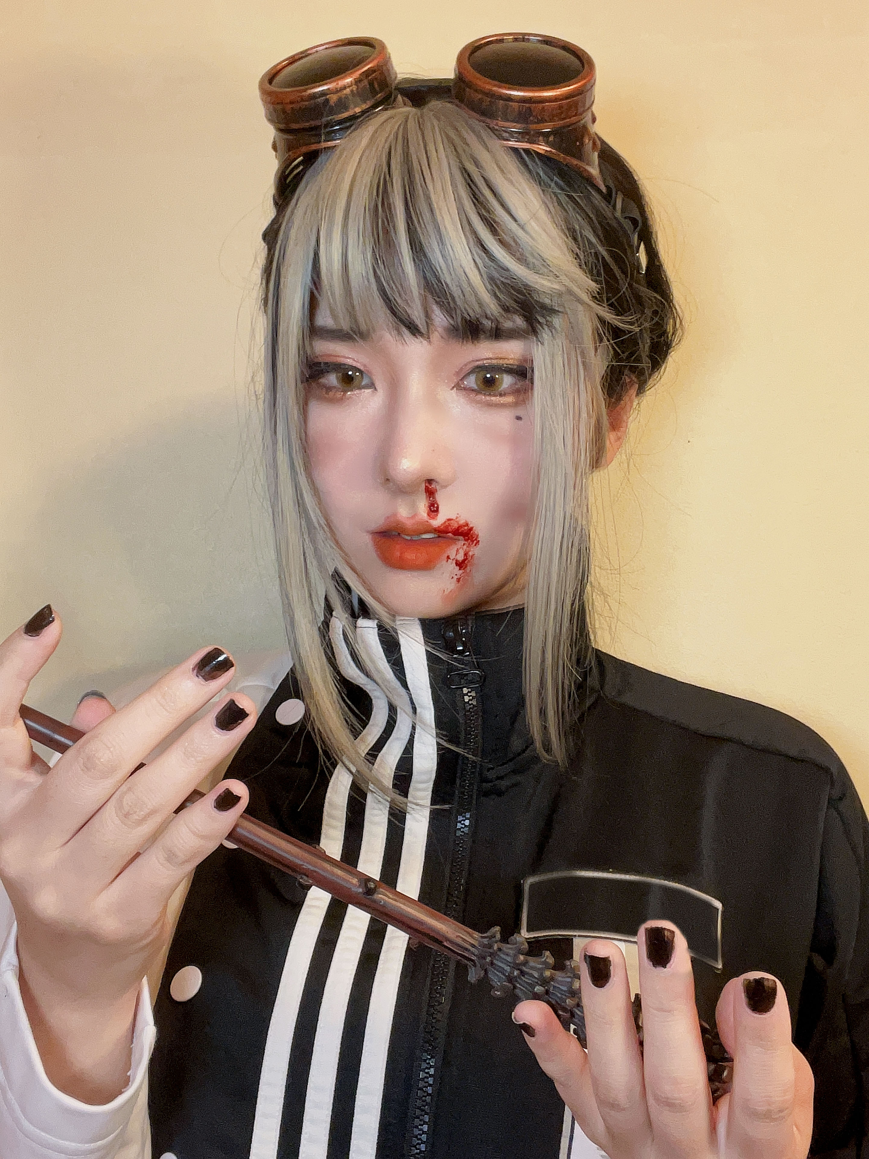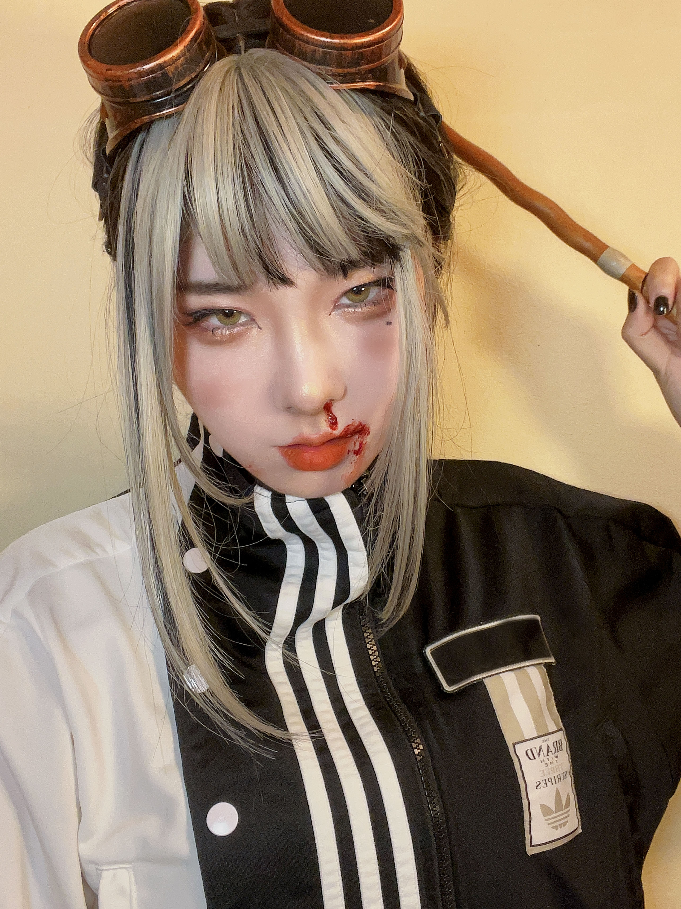 - 頭にエンジニアゴーグル、パンツスタイルに雪駄。レッグポーチをつけているのが基本。冬になると五本指ソックスを加える。 ネクタイを結ぶのが下手くそなため、常に前後の長さがチグハグでローブの羽織方も雑。 ワイシャツもはみ出てることが多い。