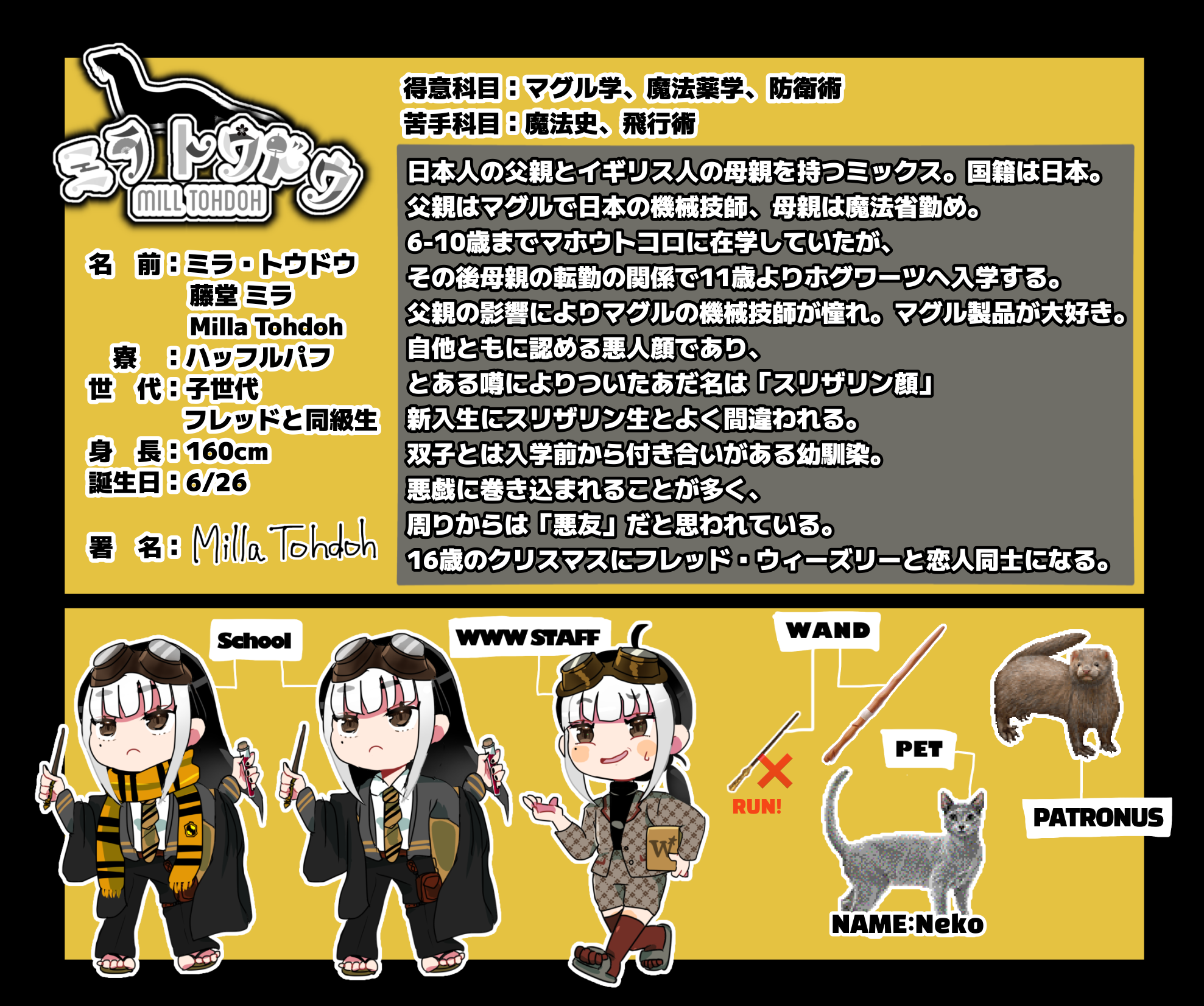 このことからついたあだ名は「スリザリン顔」。新学期を迎えるたびにスリザリンの新入生に寮の合言葉を尋ねられるミラはたびたび目撃される。