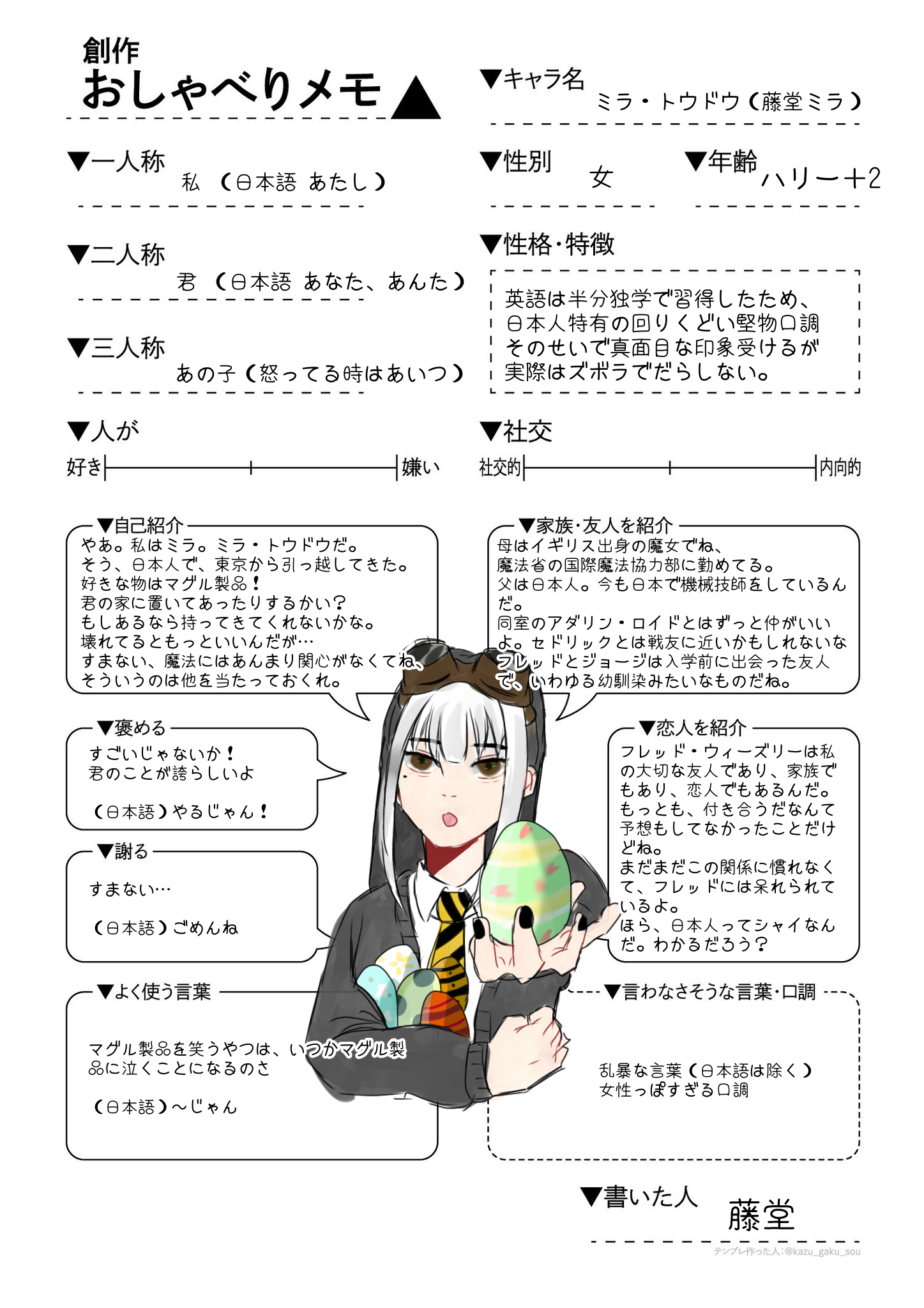 日本にいる間に半分独学で英語を勉強したせいで 回りくどい堅物口調。そのため、しっかり者に見られることが多いが根はだらしなく不器用で鈍感でアホ。本人はいたって真面目。日本語になると口が悪い。