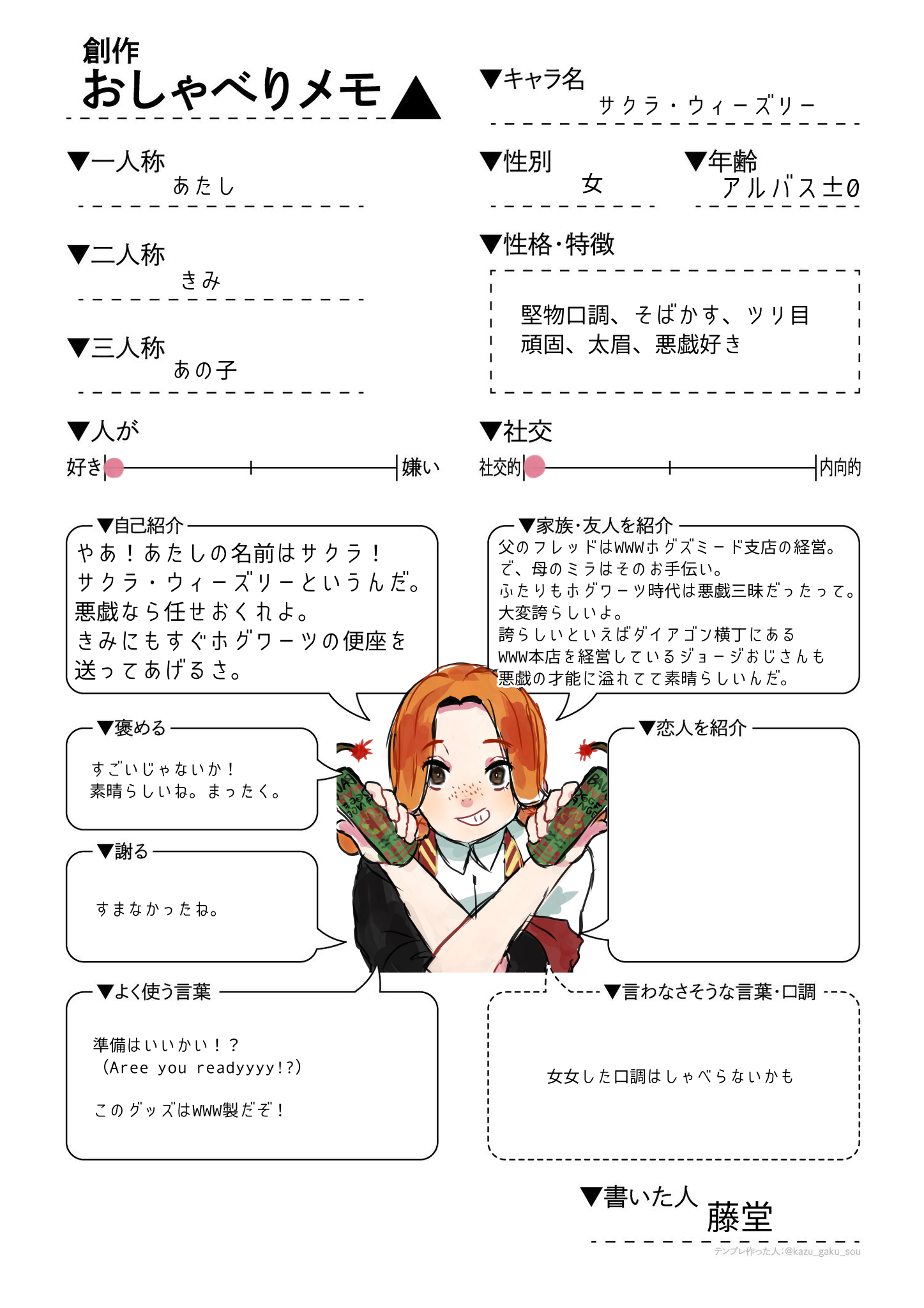 戦争を生き抜き、魔法界を命がけで守った両親を心から尊敬している。夢はWWWの日本進出とそこの経営を任せてもらうこと。夢を実現させるため、ホグワーツを走り回る毎日である。